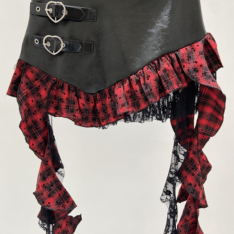 Make a bold statement with the Asymmetric Ruffled Alt Skirt! This unique and stylish skirt blends gothic, punk, witchy, emo, and grunge aesthetics, creating the ultimate dark fashion piece. Featuring heart buckles, long asymmetric plaid fabric, and delicate black lace ruffles, this skirt is perfect for alternative fashion lovers. Order now and express your edgy style!
